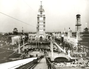 Tra la fine dell’Ottocento e l’inizio del Novecento nacquero i tre celebri parchi, Steeplechase Park, Luna Park e Dreamland – quest’ultimo un sogno durato soli 7 anni e completamente distrutto da un incendio nel 1911 – veri laboratori visionari dell’immaginario urbano. Qui l’elettricità, ancora una novità a quell’epoca, divenne spettacolo: migliaia di lampadine illuminavano le notti estive trasformando la spiaggia in un miraggio luminoso. Le montagne russe, le giostre, gli spettacoli circensi e le attrazioni meccaniche incarnavano la cieca fiducia nel progresso, ma anche una fascinazione per l’illusione e per la teatralità del mondo moderno. Luna Park, inaugurato nel 1903, con le sue torri, cupole e facciate orientaleggianti, rappresentava un’esperienza estetica totale, una città fantasmagorica costruita per stupire.