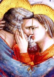 E il bacio nell’Arte? In ogni tempo, il bacio ha ispirato quasi tutti i pittori. Il primo bacio raffigurato in pittura è attribuito a Giotto (1303/05) e si trova a Padova nella Cappella degli Scrovegni. È il bacio tra Gioacchino e Anna, genitori della Vergine Maria.