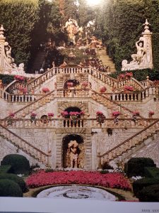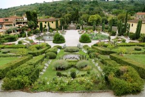 In questo modo si intrecciano architettura, ornamenti statuari, vegetazione, acqua, seguendo un andamento ascensionale a partire dal doppio ordine di parterre en broderie, (giardino su una superficie piana, costituito da aiuole a modelli simmetrici, separate e collegate da sentieri di ghiaia), salendo la scalinata monumentale a tre doppie rampe, con grotta e statue e una collezione di agrumi (cedrini e portogalli) e rose, il viale degli Imperatori (statue che richiamano l’antichità greco-romana), la fila di cipressi potati con “finestre” aperte sui busti all’antica. Ai lati c’è il bosco dei lecci attraversato dai sentieri che conducono al teatro di verzura, con quinte di tasso e statue allegoriche della Tragedia e della Commedia, al bambuseto (bosco di bambù) in prossimità del percorso d’acqua che separa giardino e palazzo, e al labirinto di bosso.